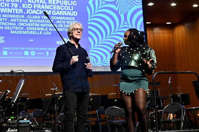 Stewart Copeland, musicien, batteur et fondateur du groupe The Police, et Yemi Alade durant la soirée d'ouverture du MIDEM+24, salle Debussy au Palais des Festivals à Cannes, le 24 janvier 2024. D.Lisnard, le maire de Cannes, entouré de J.M.Jarre et B.Désveaux, le directeur général du groupe Hopscotch, ont lancé cette soirée avant que les parrains S.Copeland et Y.Alade déclarent officiellement le MIDEM+24 ouvert. C'est l'orchestre national de Cannes dirigé par P.A.Valade avec à la flute F.Bontron et Y.Deutsch à la guitare qui a débuté les concerts qui vont se succéder jusqu'au 27 janvier. Le MIDƐM+ est le rendez-vous incontournable de l'industrie musicale, dans sa nouvelle formule initiée par la ville de Cannes et le Palais des Festivals et des Congrès, rassemble toute la profession. Ce salon est aussi une grande fête pour le grand public avec des concerts, des DJ sets et des show cases. © Bruno Bebert / Bestimage MIDEM+24 opening night at the Palais des Festivals in Cannes. On January 24th 2024