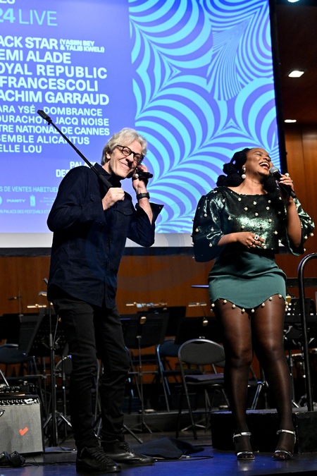 Stewart Copeland, musicien, batteur et fondateur du groupe The Police, et Yemi Alade durant la soirée d'ouverture du MIDEM+24, salle Debussy au Palais des Festivals à Cannes, le 24 janvier 2024. D.Lisnard, le maire de Cannes, entouré de J.M.Jarre et B.Désveaux, le directeur général du groupe Hopscotch, ont lancé cette soirée avant que les parrains S.Copeland et Y.Alade déclarent officiellement le MIDEM+24 ouvert. C'est l'orchestre national de Cannes dirigé par P.A.Valade avec à la flute F.Bontron et Y.Deutsch à la guitare qui a débuté les concerts qui vont se succéder jusqu'au 27 janvier. Le MIDƐM+ est le rendez-vous incontournable de l'industrie musicale, dans sa nouvelle formule initiée par la ville de Cannes et le Palais des Festivals et des Congrès, rassemble toute la profession. Ce salon est aussi une grande fête pour le grand public avec des concerts, des DJ sets et des show cases. © Bruno Bebert / Bestimage MIDEM+24 opening night at the Palais des Festivals in Cannes. On January 24th 2024