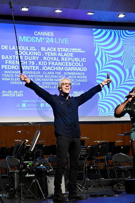 Stewart Copeland, musicien, batteur et fondateur du groupe The Police, durant la soirée d'ouverture du MIDEM+24, salle Debussy au Palais des Festivals à Cannes, le 24 janvier 2024. D.Lisnard, le maire de Cannes, entouré de J.M.Jarre et B.Désveaux, le directeur général du groupe Hopscotch, ont lancé cette soirée avant que les parrains S.Copeland et Y.Alade déclarent officiellement le MIDEM+24 ouvert. C'est l'orchestre national de Cannes dirigé par P.A.Valade avec à la flute F.Bontron et Y.Deutsch à la guitare qui a débuté les concerts qui vont se succéder jusqu'au 27 janvier. Le MIDƐM+ est le rendez-vous incontournable de l'industrie musicale, dans sa nouvelle formule initiée par la ville de Cannes et le Palais des Festivals et des Congrès, rassemble toute la profession. Ce salon est aussi une grande fête pour le grand public avec des concerts, des DJ sets et des show cases. © Bruno Bebert / Bestimage MIDEM+24 opening night at the Palais des Festivals in Cannes. On January 24th 2024