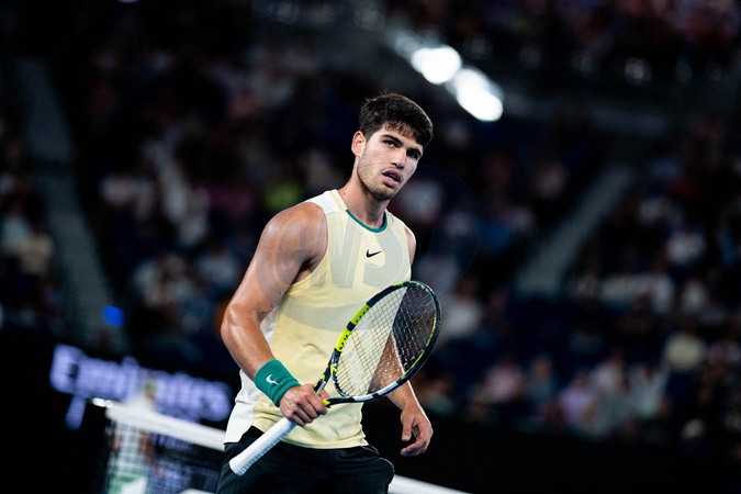 Carlos Alcaraz (ESP) lors du quart de finale de l'Open d'Australie au Rod Laver Arena à Melbourne, Australie, le 25 janvier 2024. A. Zverev gagne 6-1, 6-3, 6-7 [2], 6-4. © Virginie Bouyer/Panoramic/Bestimage Quarterfinals singles match between Carlos Alcaraz of Spain and Alexander Zverev of Germany during the 2024 Australian Open at Melbourne Park on January 24, 2024 in Melbourne, Australia.