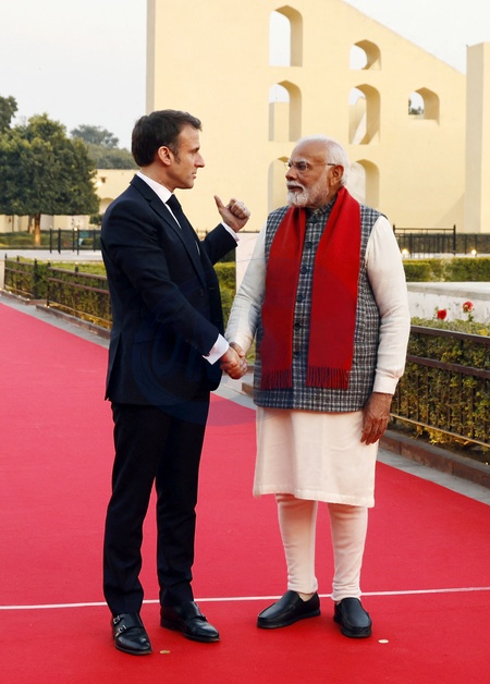 Premier Indii Narendra Modi i prezydent Francji Emmanuel Macron podczas wizyty w Obserwatorium Janta Mantar w Jaipu
