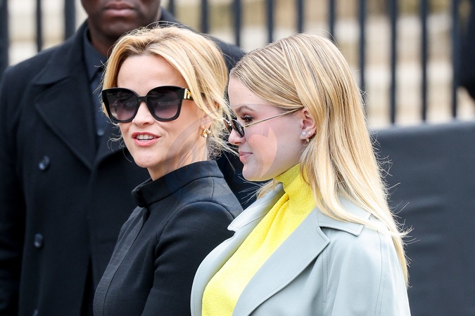 Reese Witherspoon et sa fille Ava Elizabeth Phillippe sortent de leur hôtel pour se rendre au défilé Fendi Lors de la Fashion Week de Paris (PFW), à Paris, France, le 25 janvier 2024. Reese Witherspoon and her daughter Ava Elizabeth Phillippe exit their hotel to attend the Fendi fashion show during Paris Fashion Week (PFW) in Paris, France on January 25, 2024.
