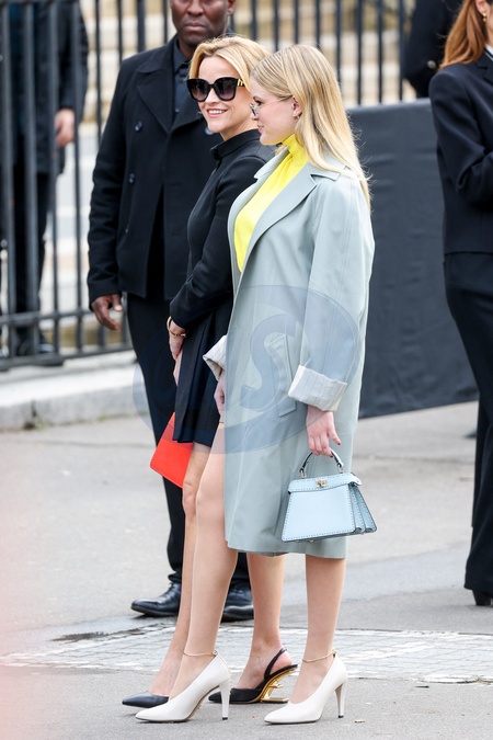Reese Witherspoon et sa fille Ava Elizabeth Phillippe sortent de leur hôtel pour se rendre au défilé Fendi Lors de la Fashion Week de Paris (PFW), à Paris, France, le 25 janvier 2024. Reese Witherspoon and her daughter Ava Elizabeth Phillippe exit their hotel to attend the Fendi fashion show during Paris Fashion Week (PFW) in Paris, France on January 25, 2024.