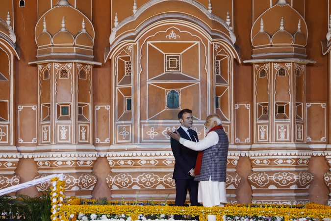 Premier Indii Narendra Modi i prezydent Francji Emmanuel Macron odwiedzają Hawa Mahal, znany również jako Pałac Wiatrów w Jaipur