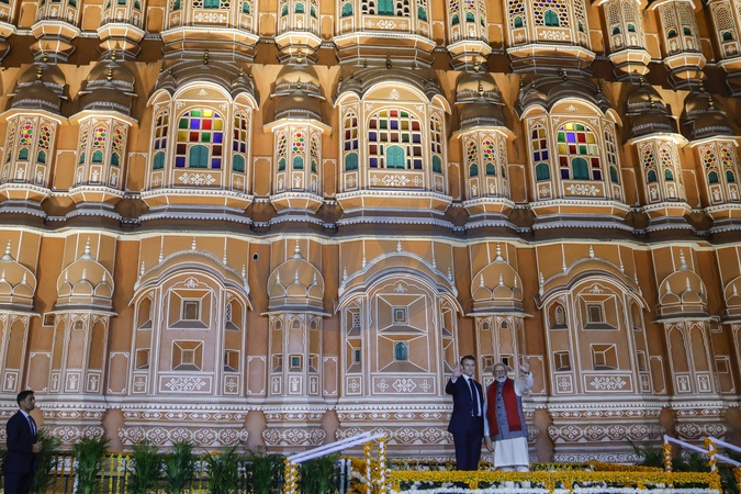 Premier Indii Narendra Modi i prezydent Francji Emmanuel Macron odwiedzają Hawa Mahal, znany również jako Pałac Wiatrów w Jaipur