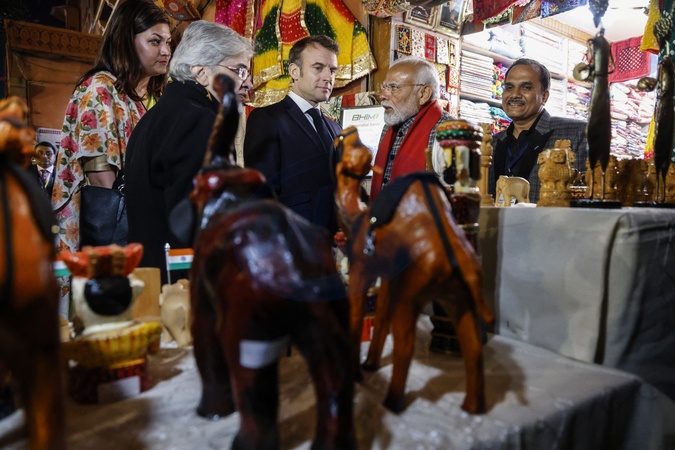 Premier Indii Narendra Modi i prezydent Francji Emmanuel Macron odwiedzają Hawa Mahal, znany również jako Pałac Wiatrów w Jaipur