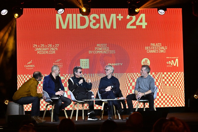 Jean-Michel Jarre et Stewart Coppeland (Police) participent à une table ronde "Vers la singularité : quand les artistes et l’IA transcendent le GPTs" lors du Midem à Cannes