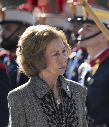 La reine Sofia lors de l'acte de serment devant le drapeau à la caserne "El Rey" de la Garde royale à Madrid, le 26 janvier 2024. Queen Sofia attends the Flag ceremony at the Cuartel del Rey. El Pardo, Madrid. January 26th, 2024.