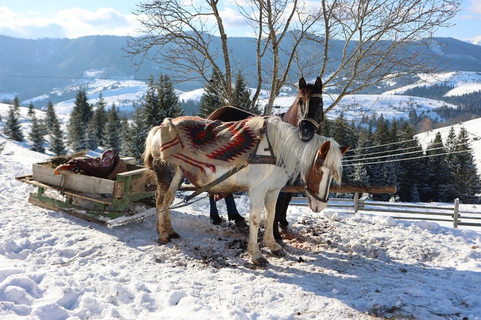 IVANO-FRANKIVSK REGION, UKRAINE - JANUARY 21, 2024 - Two horses and a cart are seen in the snow-drifted Carpathian Mountains in winter, Ivano-Frankivsk region, western Ukraine., Credit:Yurii Rylchuk / Avalon
