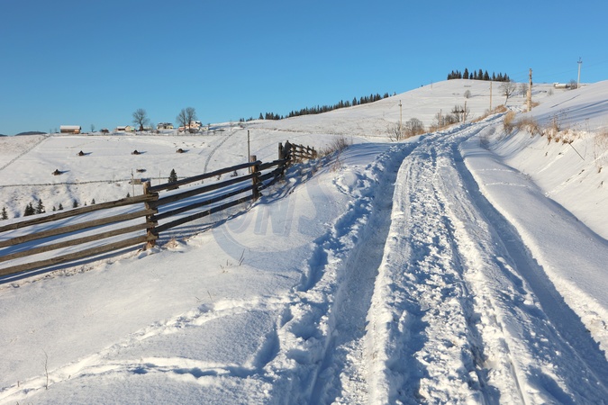 IVANO-FRANKIVSK REGION, UKRAINE - JANUARY 21, 2024 - The tracks run along a fence in the snow-drifted Carpathian Mountains in winter, Ivano-Frankivsk region, western Ukraine., Credit:Yurii Rylchuk / Avalon