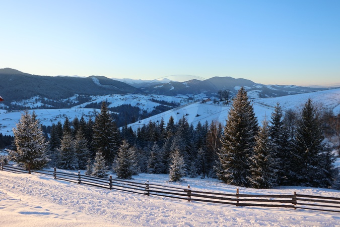 IVANO-FRANKIVSK REGION, UKRAINE - JANUARY 21, 2024 - A fence runs along the edge of spruce trees in the snow-drifted Carpathian Mountains in winter, Ivano-Frankivsk region, western Ukraine., Credit:Yurii Rylchuk / Avalon