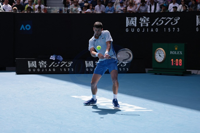 Novak Djokovic éliminé en demi-finale par J.Sinner (6-1, 6-2, 6-7 [8-6], 6-3) lors de l'Open d'Australie à Melbourne, le 26 janvier 2024. © Panoramic / Bestimage Novak Djokovic eliminated in the semi-final by J.Sinner (6-1, 6-2, 6-7 [8-6], 6-3) at the Australian Open in Melbourne, January 26, 2024.