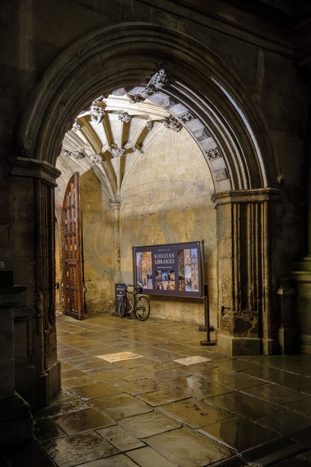 Bodleian library archway at night in the rain.Oxford, Oxfordshire . United Kingdom. 25 January 2024, Credit:Mark Fairhurst / Avalon