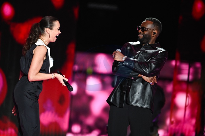Exclusif - Nadine Sierra et Gims - Scène - Concert événement "Le gala des pièces jaunes" à l'Accor Arena Paris le 26 janvier 2024. Une soirée de gala exceptionnelle en faveur desPièces Jaunes !De nombreux artistes se succèderont pour chanter pour les enfants et adolescents hospitalisés. © Guillaume Gaffiot / Cyril Moreau / Bestimage Exclusive - No web en Suisse / Belgique Concert event "Le gala des pièces jaunes" at the Accor Arena Paris on 26 January 2024. An exceptional gala evening in aid of the Pièces Jaunes! A host of artists will perform for children and teenagers in hospital.