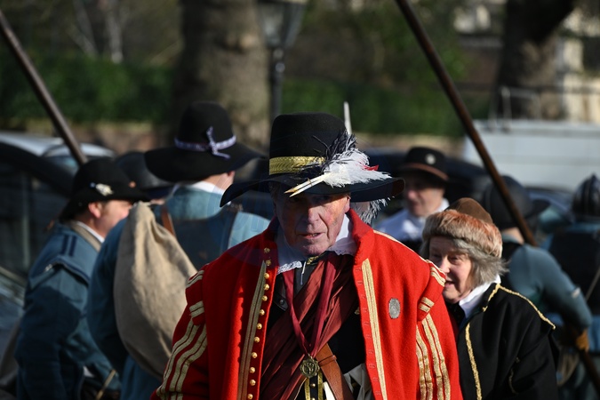Rekonstruktorzy angielskiej wojny domowej maszerują wzdłuż centrum handlowego do Horseguards w Londynie, Wielka Brytania, 28 stycznia 2024 r.
