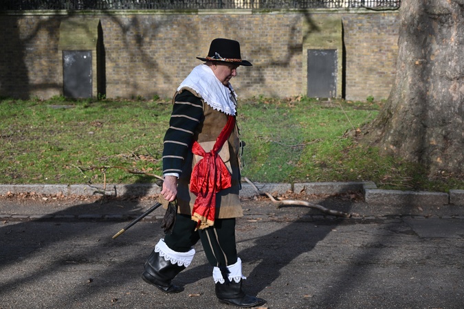 Rekonstruktorzy angielskiej wojny domowej maszerują wzdłuż centrum handlowego do Horseguards w Londynie, Wielka Brytania, 28 stycznia 2024 r.