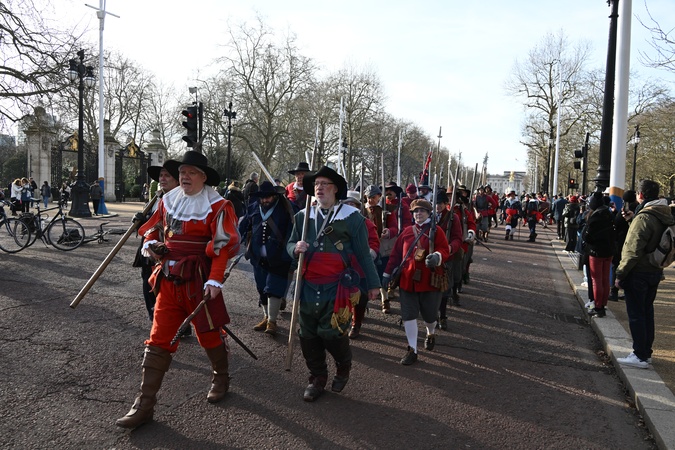 English Civil War reenactors march along The Mall to Horseguards in London, UK, on 28th January, 2024