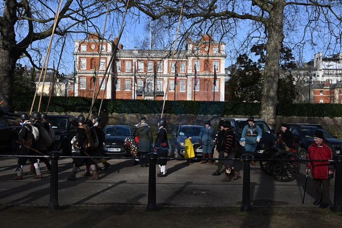 Rekonstruktorzy angielskiej wojny domowej maszerują wzdłuż centrum handlowego do Horseguards w Londynie, Wielka Brytania, 28 stycznia 2024 r.