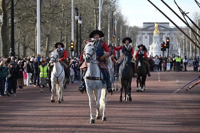 The Mall, London, UK. 28th Jan, 2024. English Civil War reenactors march from St James Palace to Horseguards Parade to hold their annual ceremony and service in memory of the beheaded monarch Charles I. On 30 January 1649 Charles I was beheaded on a scaffold outside the Banqueting House in Whitehall, Credit:MALCOLM PARK / Avalon