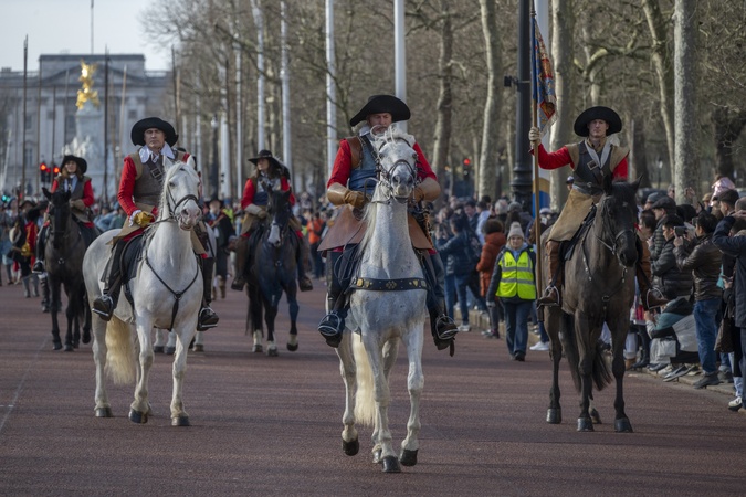 The Mall, London, UK. 28th Jan, 2024. English Civil War reenactors march from St James Palace to Horseguards Parade to hold their annual ceremony and service in memory of the beheaded monarch Charles I. On 30 January 1649 Charles I was beheaded on a scaffold outside the Banqueting House in Whitehall, Credit:MALCOLM PARK / Avalon