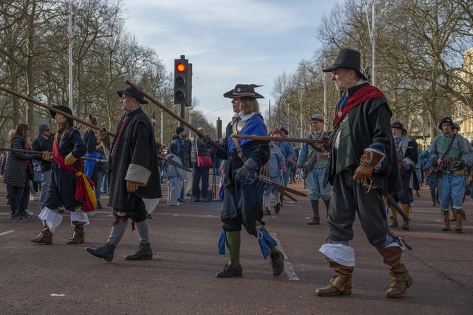 English Civil War reenactors march along The Mall to Horseguards in London, UK, on 28th January, 2024