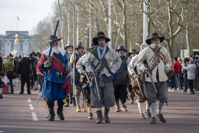 English Civil War reenactors march along The Mall to Horseguards in London, UK, on 28th January, 2024