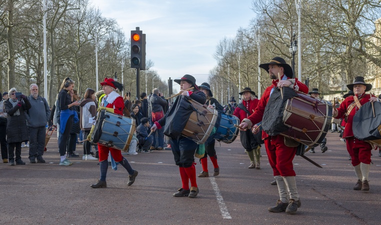 English Civil War reenactors march along The Mall to Horseguards in London, UK, on 28th January, 2024