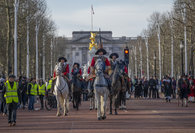 The Mall, London, UK. 28th Jan, 2024. English Civil War reenactors march from St James Palace to Horseguards Parade to hold their annual ceremony and service in memory of the beheaded monarch Charles I. On 30 January 1649 Charles I was beheaded on a scaffold outside the Banqueting House in Whitehall, Credit:MALCOLM PARK / Avalon