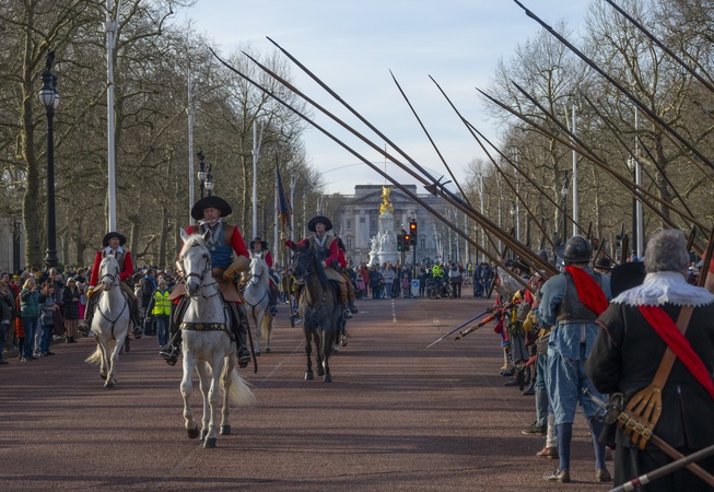 English Civil War reenactors march along The Mall to Horseguards in London, UK, on 28th January, 2024