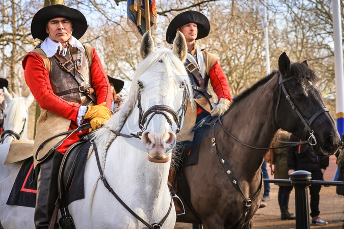 London, UK 28th Jan 2024. A beautiful horse called Maggie patiently waits for the mounted volunteers of the King's Army to assemble. Every Year, the English Civil War Society's volunteers with The Kings Army, march along the Mall in central London and to Horse Guards Parade, in Commemoration of Charles I, who was martyred 30th January 1649. Each regiment in the re-enactment consists of officers, muskets, followed by the colour, drummers, pikemen and baggage (women and children). The procession is led by the Lord General of the Kings Army, and the horsemen., Credit:Imageplotter / Avalon