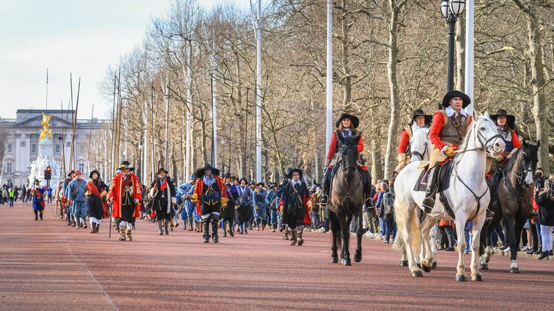 London, UK 28th Jan 2024. The procession on the Mall. Every Year, the English Civil War Society's volunteers with The Kings Army, march along the Mall in central London and to Horse Guards Parade, in Commemoration of Charles I, who was martyred 30th January 1649. Each regiment in the re-enactment consists of officers, muskets, followed by the colour, drummers, pikemen and baggage (women and children)., Credit:Imageplotter / Avalon