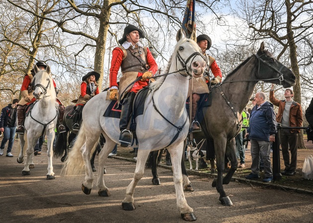 London, UK 28th Jan 2024. Volunteers assemble and get ready to march. Every Year, the English Civil War Society's volunteers with The Kings Army, march along the Mall in central London and to Horse Guards Parade, in Commemoration of Charles I, who was martyred 30th January 1649. Each regiment in the re-enactment consists of officers, muskets, followed by the colour, drummers, pikemen and baggage (women and children). The procession is led by the Lord General of the Kings Army, and the horsemen., Credit:Imageplotter / Avalon