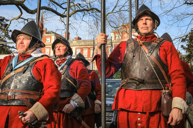 London, UK 28th Jan 2024. Volunteers assemble and get ready to march. Every Year, the English Civil War Society's volunteers with The Kings Army, march along the Mall in central London and to Horse Guards Parade, in Commemoration of Charles I, who was martyred 30th January 1649. Each regiment in the re-enactment consists of officers, muskets, followed by the colour, drummers, pikemen and baggage (women and children). The procession is led by the Lord General of the Kings Army, and the horsemen., Credit:Imageplotter / Avalon