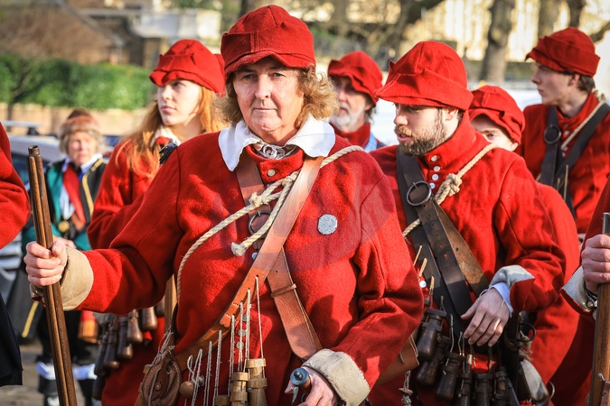 London, UK 28th Jan 2024. Volunteers assemble and get ready to march. Every Year, the English Civil War Society's volunteers with The Kings Army, march along the Mall in central London and to Horse Guards Parade, in Commemoration of Charles I, who was martyred 30th January 1649. Each regiment in the re-enactment consists of officers, muskets, followed by the colour, drummers, pikemen and baggage (women and children). The procession is led by the Lord General of the Kings Army, and the horsemen., Credit:Imageplotter / Avalon