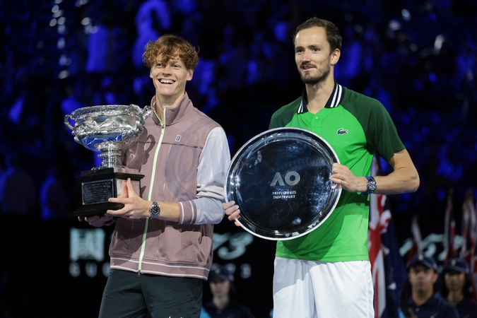 Jannik Sinner et Daniil Medvedev - J.Sinner remporte la finale de l'Open d'Australie en battant Daniil Medvedev (3-6, 3-6, 6-4, 6-4, 6-3) à Melbourne, le 28 janvier 2024. © Panoramic / Bestimage J.Sinner wins the final of the Australian Open by beating D.Medvedev (3-6, 3-6, 6-4, 6-4, 6-3) in Melbourne, January 28, 2024