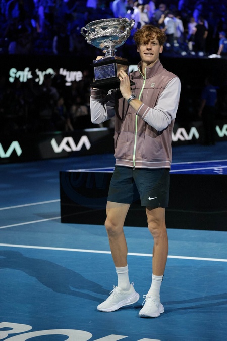 Jannik Sinner - J.Sinner remporte la finale de l'Open d'Australie en battant Daniil Medvedev (3-6, 3-6, 6-4, 6-4, 6-3) à Melbourne, le 28 janvier 2024. © Panoramic / Bestimage J.Sinner wins the final of the Australian Open by beating D.Medvedev (3-6, 3-6, 6-4, 6-4, 6-3) in Melbourne, January 28, 2024