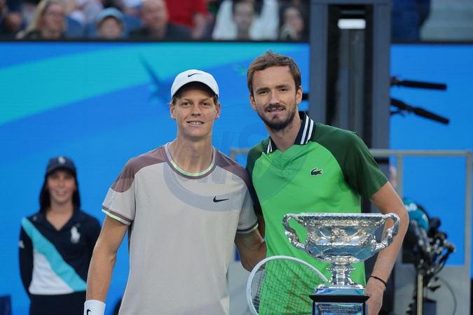 Jannik Sinner et Daniil Medvedev - J.Sinner remporte la finale de l'Open d'Australie en battant Daniil Medvedev (3-6, 3-6, 6-4, 6-4, 6-3) à Melbourne, le 28 janvier 2024. © Panoramic / Bestimage J.Sinner wins the final of the Australian Open by beating D.Medvedev (3-6, 3-6, 6-4, 6-4, 6-3) in Melbourne, January 28, 2024