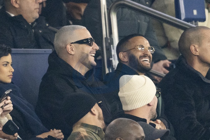 DJ Snake et Malik Bentalha - Celébrités dans les tribunes du match de Ligue 1 Uber Eats "PSG-Brest" (2-2) au Parc des Princes à Paris le 28 janvier 2024. © Cyril Moreau/Bestimage Celebrities in the stands of the Ligue 1 Uber Eats match "PSG-Brest" (2-2) at the Parc des Princes in Paris on January 28, 2024.
