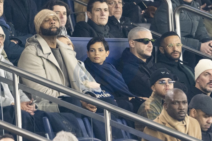 CC Sabathia, Eve Gilles, Miss France 2024, DJ Snake et Malik Bentalha - Celébrités dans les tribunes du match de Ligue 1 Uber Eats "PSG-Brest" (2-2) au Parc des Princes à Paris le 28 janvier 2024. © Cyril Moreau/Bestimage Celebrities in the stands of the Ligue 1 Uber Eats match "PSG-Brest" (2-2) at the Parc des Princes in Paris on January 28, 2024.