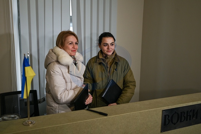 LVIV, UKRAINE - JANUARY 26, 2024 - Head of Ulf Medical Service Alina Mykhailova (R) is seen during the opening ceremony of the first recruiting center of the 1st separate battalion "Da Vinci Wolves" named after Dmytro Kotsiubailo in Lviv, western Ukraine., Credit:Anastasiia Smolienko / Avalon