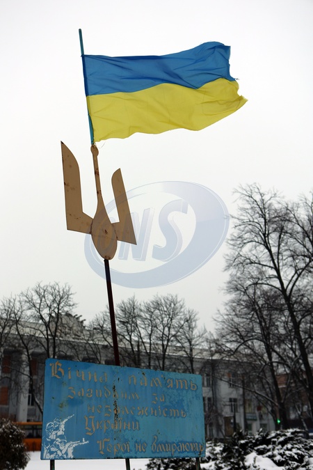 CHERNIHIV, UKRAINE - JANUARY 25, 2024 - A flag on the shaft with a trident dedicated to the fallen defenders of Ukraine, Chernihiv, northern Ukraine., Credit:Yurii Rylchuk / Avalon