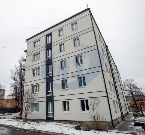 BUCHA, UKRAINE - JANUARY 24, 2024 - The restored facade of one of the buildings repaired after the de-occupation of Bucha, Kyiv region, north-central Ukraine., Credit:Pavlo_Bagmut / Avalon