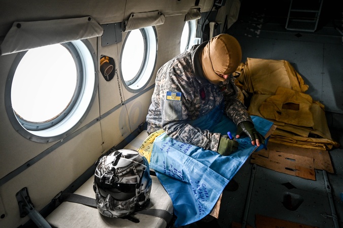 UKRAINE - JANUARY 24, 2024 - A serviceman of the 11th separate army aviation brigade "Kherson" of the Armed Forces of Ukraine leaves an inscription on the flag of Ukraine, Ukraine., Credit:Dmytro Smolienko / Avalon