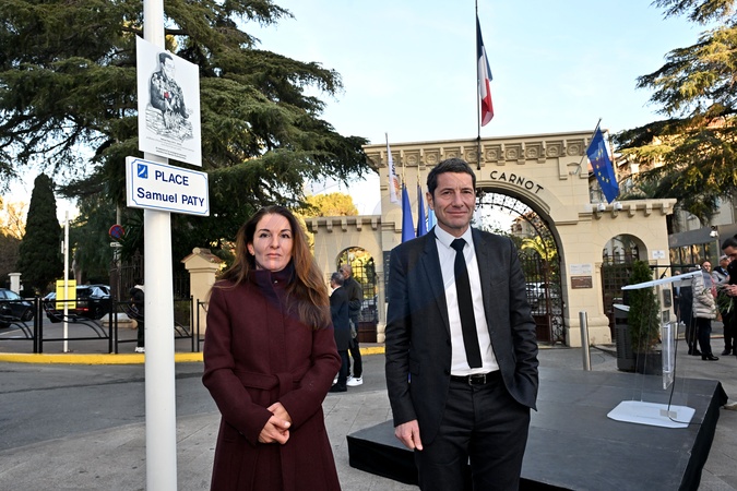 David Lisnard, le maire de Cannes) et Mickaëlle Paty ont inauguré la «Place Samuel Paty» située devant le lycée Carnot à Cannes, 29 janvier 2024. À cette occasion, une plaque commémorative a été dévoilée pour entretenir la mémoire de Samuel, défendre les valeurs de la République française et lutter contre l'islamisme et le fanatisme religieux quel qu'il soit. Samuel Paty, professeur d'histoire-géographie, est assassiné par arme blanche et décapité peu après être sorti de son collège de Conflans-Sainte-Honorine. L'assassin, Abdoullakh Anzorov, est un citoyen russe d'origine tchétchène âgé de 18 ans et qui bénéficie du statut de réfugié, accordé à ses parents alors qu'il était mineur. Il est abattu par la police quelques minutes après l'attentat. © Bruno Bebert / Bestimage David Lisnard, Mayor of Cannes) and Mickaëlle Paty inaugurated the "Place Samuel Paty" in front of the Lycée Carnot in Cannes on 29 January 2024. On this occasion, a commemorative plaque was unveiled to keep Samuel's memory alive, defend the values of the French Republic and fight against Islamism and religious fanaticism of any kind. Samuel Paty, a history and geography teacher, was stabbed to death and decapitated shortly after leaving his school in Conflans-Sainte-Honorine. The murderer, Abdoullakh Anzorov, was an 18-year-old Russian citizen of Chechen origin who had been granted refugee status by his parents when he was a minor. He was shot dead by the police a few minutes after the attack.