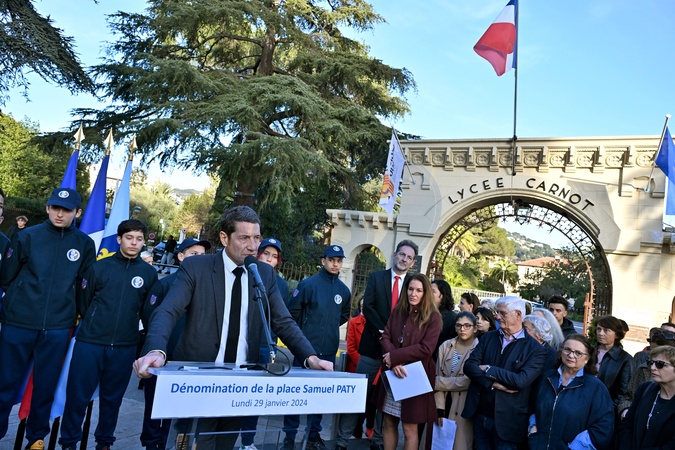 David Lisnard, le maire de Cannes) et Mickaëlle Paty ont inauguré la «Place Samuel Paty» située devant le lycée Carnot à Cannes, 29 janvier 2024. À cette occasion, une plaque commémorative a été dévoilée pour entretenir la mémoire de Samuel, défendre les valeurs de la République française et lutter contre l'islamisme et le fanatisme religieux quel qu'il soit. Samuel Paty, professeur d'histoire-géographie, est assassiné par arme blanche et décapité peu après être sorti de son collège de Conflans-Sainte-Honorine. L'assassin, Abdoullakh Anzorov, est un citoyen russe d'origine tchétchène âgé de 18 ans et qui bénéficie du statut de réfugié, accordé à ses parents alors qu'il était mineur. Il est abattu par la police quelques minutes après l'attentat. © Bruno Bebert / Bestimage David Lisnard, Mayor of Cannes) and Mickaëlle Paty inaugurated the "Place Samuel Paty" in front of the Lycée Carnot in Cannes on 29 January 2024. On this occasion, a commemorative plaque was unveiled to keep Samuel's memory alive, defend the values of the French Republic and fight against Islamism and religious fanaticism of any kind. Samuel Paty, a history and geography teacher, was stabbed to death and decapitated shortly after leaving his school in Conflans-Sainte-Honorine. The murderer, Abdoullakh Anzorov, was an 18-year-old Russian citizen of Chechen origin who had been granted refugee status by his parents when he was a minor. He was shot dead by the police a few minutes after the attack.