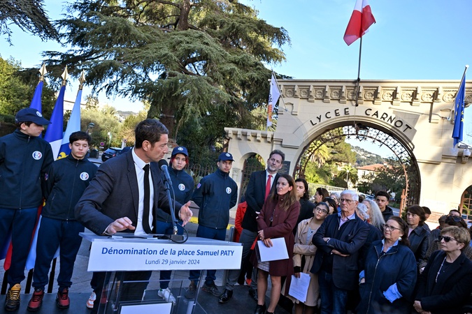 David Lisnard, le maire de Cannes) et Mickaëlle Paty ont inauguré la «Place Samuel Paty» située devant le lycée Carnot à Cannes, 29 janvier 2024. À cette occasion, une plaque commémorative a été dévoilée pour entretenir la mémoire de Samuel, défendre les valeurs de la République française et lutter contre l'islamisme et le fanatisme religieux quel qu'il soit. Samuel Paty, professeur d'histoire-géographie, est assassiné par arme blanche et décapité peu après être sorti de son collège de Conflans-Sainte-Honorine. L'assassin, Abdoullakh Anzorov, est un citoyen russe d'origine tchétchène âgé de 18 ans et qui bénéficie du statut de réfugié, accordé à ses parents alors qu'il était mineur. Il est abattu par la police quelques minutes après l'attentat. © Bruno Bebert / Bestimage David Lisnard, Mayor of Cannes) and Mickaëlle Paty inaugurated the "Place Samuel Paty" in front of the Lycée Carnot in Cannes on 29 January 2024. On this occasion, a commemorative plaque was unveiled to keep Samuel's memory alive, defend the values of the French Republic and fight against Islamism and religious fanaticism of any kind. Samuel Paty, a history and geography teacher, was stabbed to death and decapitated shortly after leaving his school in Conflans-Sainte-Honorine. The murderer, Abdoullakh Anzorov, was an 18-year-old Russian citizen of Chechen origin who had been granted refugee status by his parents when he was a minor. He was shot dead by the police a few minutes after the attack.