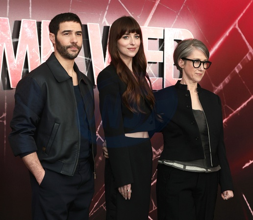 Tahar Rahim, Dakota Johnson and Director S.J. Clarkson at Madame Web photocall, London at Claridges in London, UK, on 31st January 2024, Credit:James Shaw / Avalon