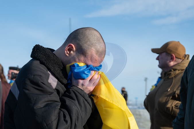 Des soldats ukrainiens de retour chez eux, à la suite d'un échange de prisonniers de guerre entre la Russie et l'Ukraine, le 31 janvier 2024. Cet échange était le 50ème retour de prisonniers de guerre et concernait 207 défenseurs ukrainiens. Ukrainian soldiers returning home, following a prisoner of war exchange between Russia and Ukraine, January 31, 2024. This exchange was the 50th return of prisoners of war and involved 207 Ukrainian defenders.