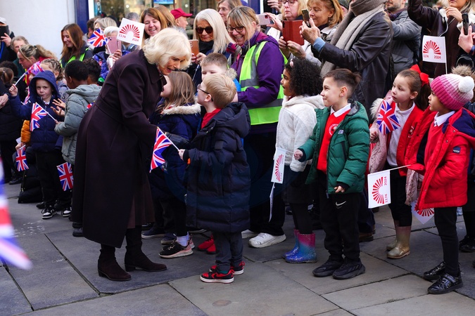 Queen Camilla meets children after attending a Service of Celebration at Bath Abbey as she carries out engagements celebrating the 850th anniversary of St John's Foundation in Bath., Credit:Ben Birchall / Avalon