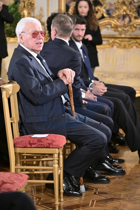 Italian President Sergio Mattarella meets the Italian tennis team, winners of the 2023 Davis Cup, at the Palazzo del Quirinale in Rome, Italy, February 1, 2024. Pictured Nicola Pietrangeli, Credit:MARIA LAURA ANTONELLI / Avalon